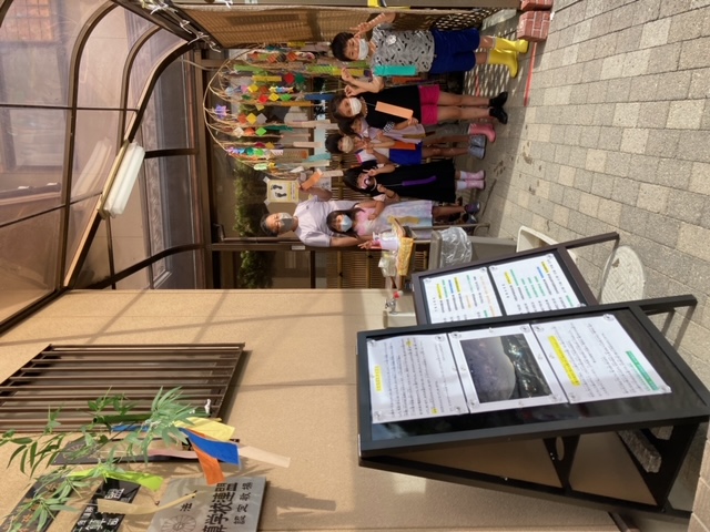 地球村星倶楽部の井戸英夫さんの協力で夏の大三角探しや七夕クイズも授業前の待ち時間に挑戦してもらいました。連日の猛暑で笹はぐったりしてしまいましたが、教室での子供達は頑張っています!